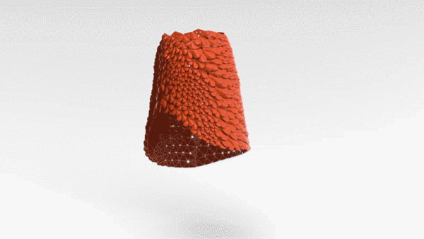 這件連衣裙與上一款裙裝一樣是一次成形的,不過(guò)在設(shè)計(jì)和實(shí)際制作上還是有所不同 :首先、它是NS總共創(chuàng)建了8種樣式才最終選定的。其次,它上面每個(gè)花瓣的長(zhǎng)寬高和方向都是通過(guò)改進(jìn)的Kinematics Clothing設(shè)計(jì)軟件實(shí)現(xiàn)控制的。最后,它是通過(guò)算法做成卷起的樣子進(jìn)行3D打印的(如上圖所示),因?yàn)槠浠驹厥腔ò?,不能折疊。這種方法還帶來(lái)了一個(gè)額外的好處,就是不同部分之間的連接處是可以隱藏起來(lái)的。如此一來(lái),裙子就能通過(guò)拆分變成其它服裝了,比如一件上衣。