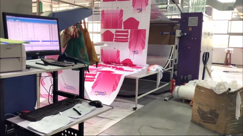 在印花生產(chǎn)方面,以機(jī)換人是劉總的一大理念。通過高自動化的鵬達(dá)轉(zhuǎn)印設(shè)備,佰億燊在轉(zhuǎn)印方面一個人可以做到一天1200米,將驗(yàn)布、卷邊全部做到自動化。