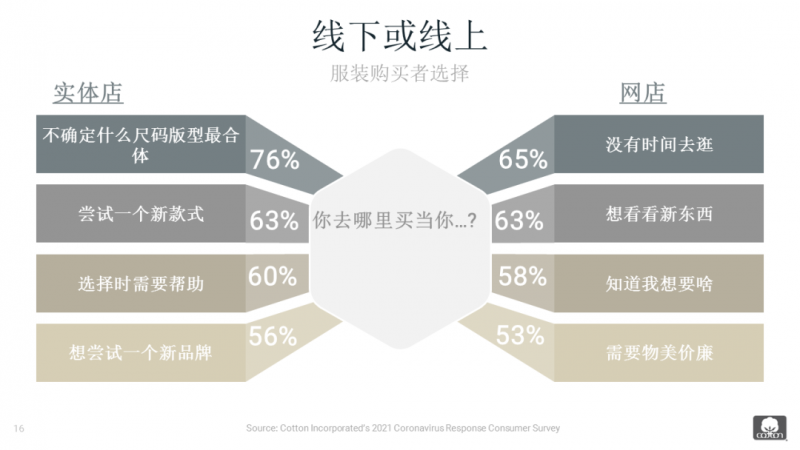 此外,疫情導(dǎo)致消費(fèi)者購物模式發(fā)生根本性改變,線上銷售額迅猛增長,其中31%來源于首次進(jìn)行線上購物的消費(fèi)者。即使疫情完全結(jié)束,線上線下融合的購物模式也將固定下來成為新常態(tài),17%的消費(fèi)者將采用線上方式購買全部或大部分物品,僅在實(shí)體店購物的群體也由之前的71%下降到51%。當(dāng)然,對于服裝購買者而言,實(shí)體店依然具有可試穿、易咨詢等優(yōu)勢。