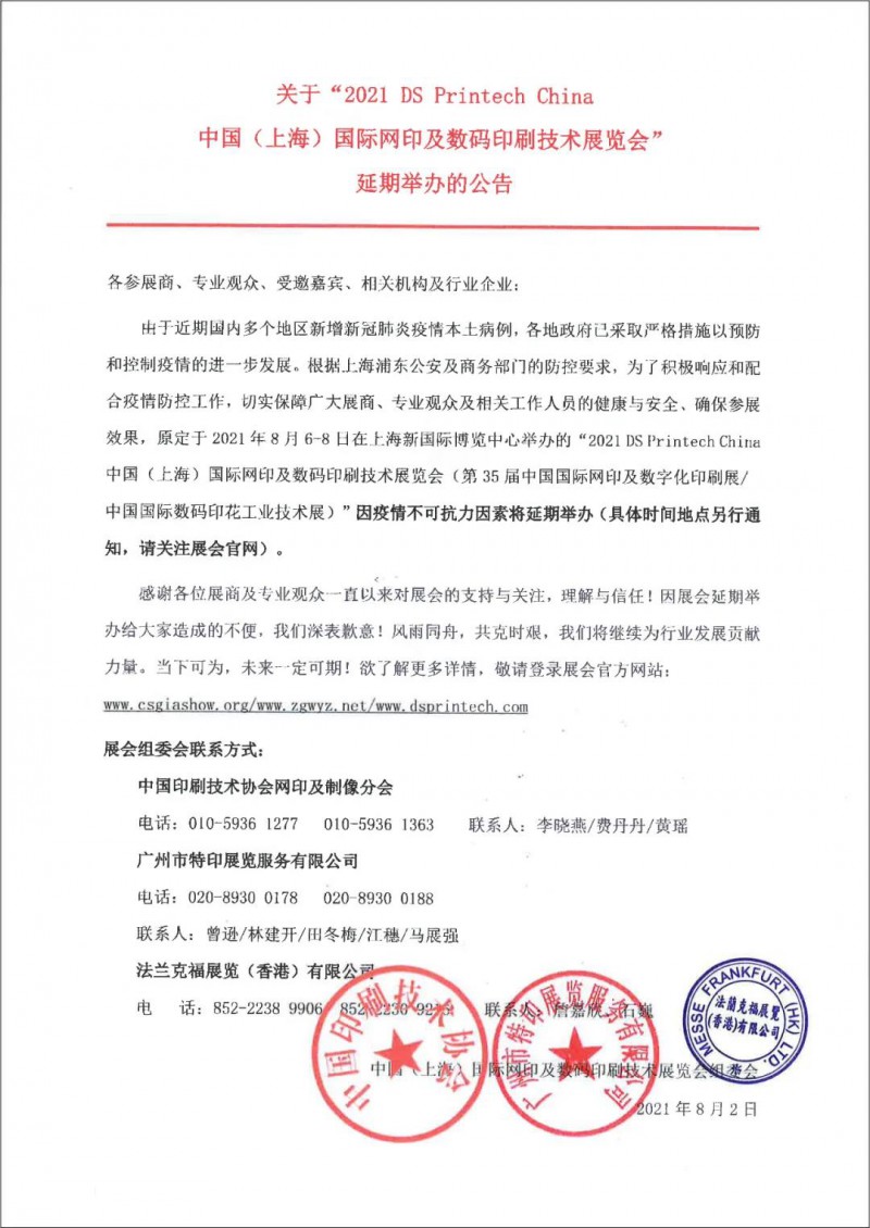關(guān)于“2021 DS Printech China中國(上海)國際網(wǎng)印及數(shù)碼印刷技術(shù)展覽會(huì)”延期舉辦的公告