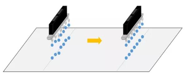 這種差異所產(chǎn)生的直觀效果就是在打印與相對(duì)移動(dòng)方向垂直的直線時(shí),直線在放大后會(huì)發(fā)現(xiàn)輕微的波動(dòng),通常這種波動(dòng)只有在距離打印畫面10~20cm時(shí)才有可能被肉眼發(fā)現(xiàn)。但是作為工業(yè)級(jí)打印頭,京瓷開發(fā)出了改善這一微小差異的對(duì)策,通過高性能的壓電片和波形的匹配,在墨滴完整的前提下,盡可能地提升墨滴吐出時(shí)的初速度,用墨滴的高飛行速度來彌補(bǔ)噴孔間的微小個(gè)體差異。吐出速度高速化后效果如下圖。