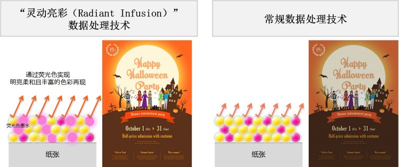 “靈動(dòng)亮彩(Radiant Infusion)”數(shù)據(jù)處理技術(shù)優(yōu)化了新開(kāi)發(fā)的熒光粉色墨水與其他顏色墨水在紙張表面上的疊加方式,實(shí)現(xiàn)明亮柔和且豐富的色彩再現(xiàn),令圖像表達(dá)更具沖擊力。隨設(shè)備附贈(zèng)的海報(bào)制作軟件PosterArtist Lite(詳見(jiàn)第三段說(shuō)明),可方便用戶(hù)輕松迅速的設(shè)計(jì)彩色海報(bào)。