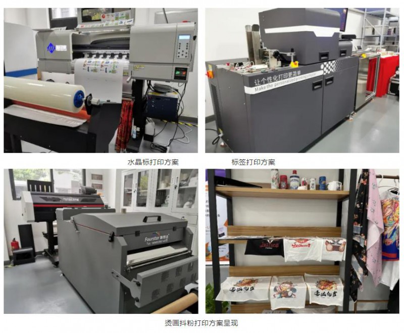 此外,還有當(dāng)下最熱門的T恤燙畫抖粉、水晶標(biāo)貼兩個應(yīng)用方案(I3200 UV打印頭)及工業(yè)級的標(biāo)簽打印方案(I3200 UV打印頭)。