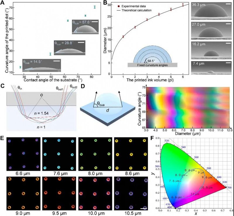 無色墨水的配方極為簡單,只需將聚丙烯酸溶解到水和乙二醇的混合物中,就可以直接制備。當(dāng)墨滴印刷在疏水透明的基底上時,在表面張力的作用下快速收縮,形成具有較大曲率角的微圓頂狀。疏水基底保證了墨滴較大的接觸角(82.5°)和較高的高度與直徑比。墨滴利用全內(nèi)反射效應(yīng)產(chǎn)生干涉顏色,且可以通過改變直徑進(jìn)行調(diào)節(jié)。比如,直徑為16.2、20.3和23.5 μm的微圓頂狀墨滴分別顯示出紅色、藍(lán)色和綠色。