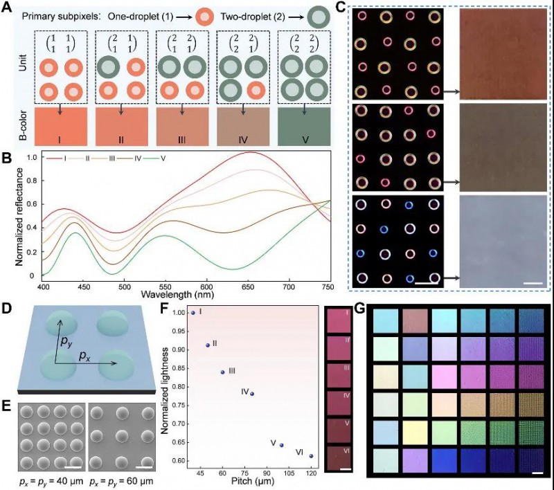 彩色微圓頂墨滴的可編程打印。圖片來源:Sci. Adv.
