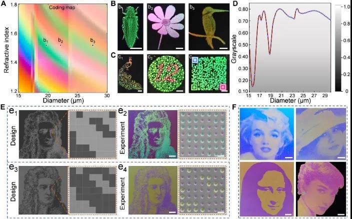 隨后,研究者通過計算機(jī)模擬獲得了全彩色打印參數(shù),只需知道墨水的折射率、接觸角等指標(biāo),就可以迅速解碼出彩色照片的信息,并轉(zhuǎn)化為微圓頂陣列,包括直徑、位置等指令發(fā)送給打印機(jī)。無需任何復(fù)雜的設(shè)計或繁瑣的工藝,即可高效地完成全彩色圖像打印,包括昆蟲、花鳥、二維碼以及人像。