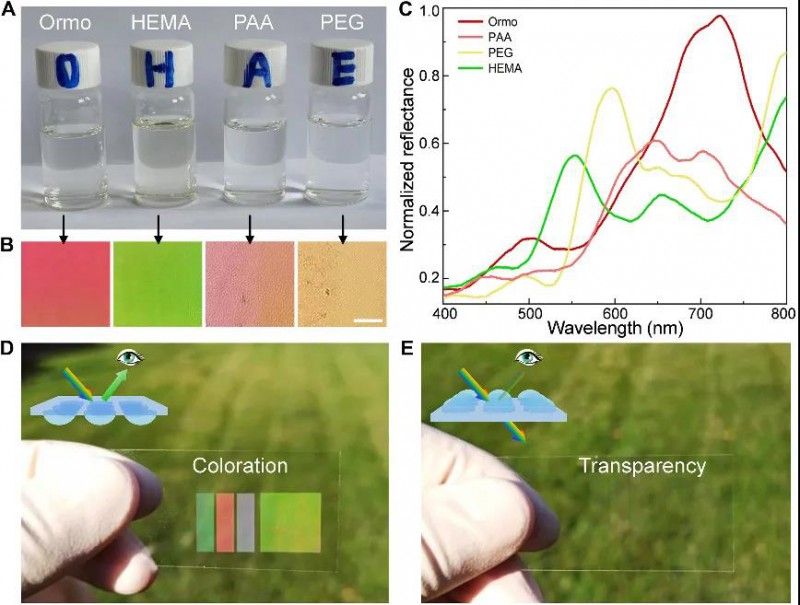有趣的是,由于印刷結(jié)構(gòu)不對稱的微觀形態(tài),圖案表現(xiàn)出光學(xué)上的“Janus”特性,即,結(jié)構(gòu)色只有從下往上看才能呈現(xiàn),如果將玻璃板翻轉(zhuǎn),它看起來幾乎是透明的。這或許在智能窗戶、動態(tài)顯示、防偽技術(shù)和傳感器等領(lǐng)域有著潛在的實際應(yīng)用價值。此外,該方法具有普適性,許多商用聚合物材料,如甲基丙烯酸羥乙酯、聚乙二醇等都可作為墨水應(yīng)用于結(jié)構(gòu)全彩色打印。