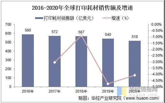 打印機的商業(yè)模式?jīng)Q定了在售出產(chǎn)品之后還會產(chǎn)生耗材銷售方面的收入,因此耗材也是打印機市場不可分割的一部分。據(jù)統(tǒng)計,2020年全球打印耗材銷售額為518億美元,同比下降4.1%。