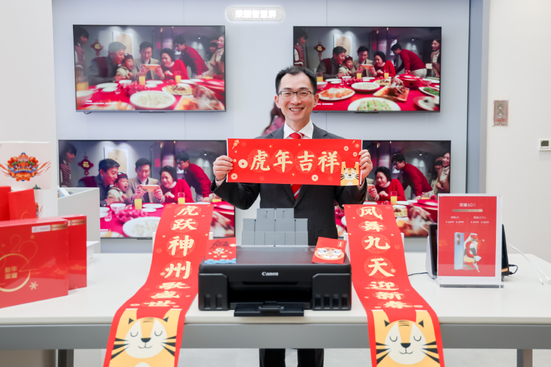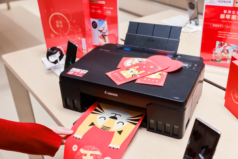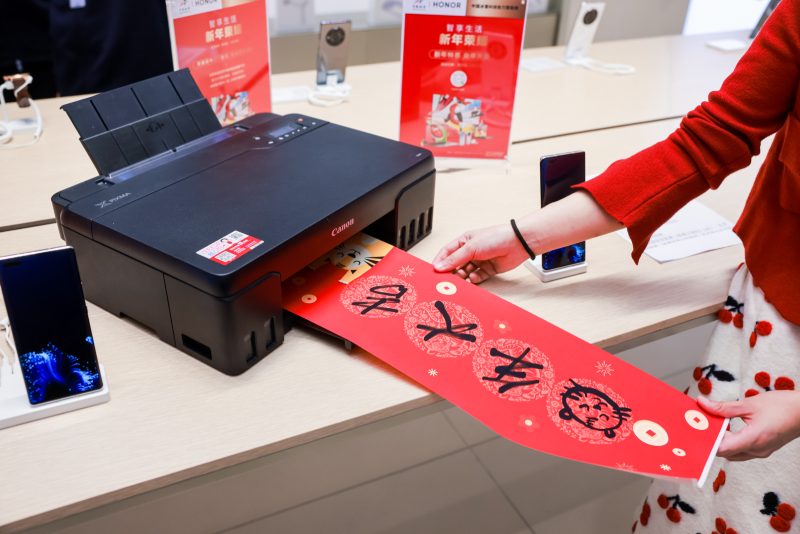 2022年1月17日,虎年春節(jié)將至,大街小巷中洋溢著喜氣洋洋的熱烈氛圍,家家戶戶都在為了新年置辦年貨。為了給新春“佳”年味,佳能(中國)有限公司(以下簡稱“佳能”)將佳能打印機騰彩PIXMA G580安置在北京、上海、深圳、重慶等全國100余家榮耀專賣店中,為用戶帶來新穎的打印體驗,助力榮耀新春年貨節(jié)?;顒蝇F(xiàn)場,用戶可以使用榮耀DIY彩聯(lián)APP,通過佳能打印機打印紅包和春聯(lián),為新年增加一份祝福與歡樂。