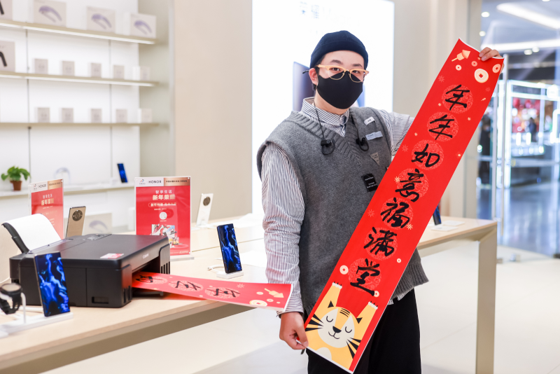據(jù)悉,這次新春年貨節(jié)活動將持續(xù)到2022年1月30日,用戶可以在北京、上海、深圳、重慶等全國100余家榮耀專賣店,通過購機或體驗方式,打印獲得新年禮盒或春聯(lián)紅包。在北京薈聚購物中心榮耀高級授權體驗店,用戶紛紛在店中的佳能打印體驗區(qū)駐足,并使用佳能打印機輸出新意滿滿、充滿年味的春聯(lián)和紅包。這些春聯(lián)和紅包可以根據(jù)用戶的創(chuàng)意進行個性化定制,每一份都獨一無二。在活動現(xiàn)場,有不少用戶借此機會向孩子們介紹春節(jié)的意義,更有許多年輕人現(xiàn)場發(fā)揮創(chuàng)意, 自己動手制作專屬新春年貨,將虎年氛圍裝扮到居家的每個細節(jié)。