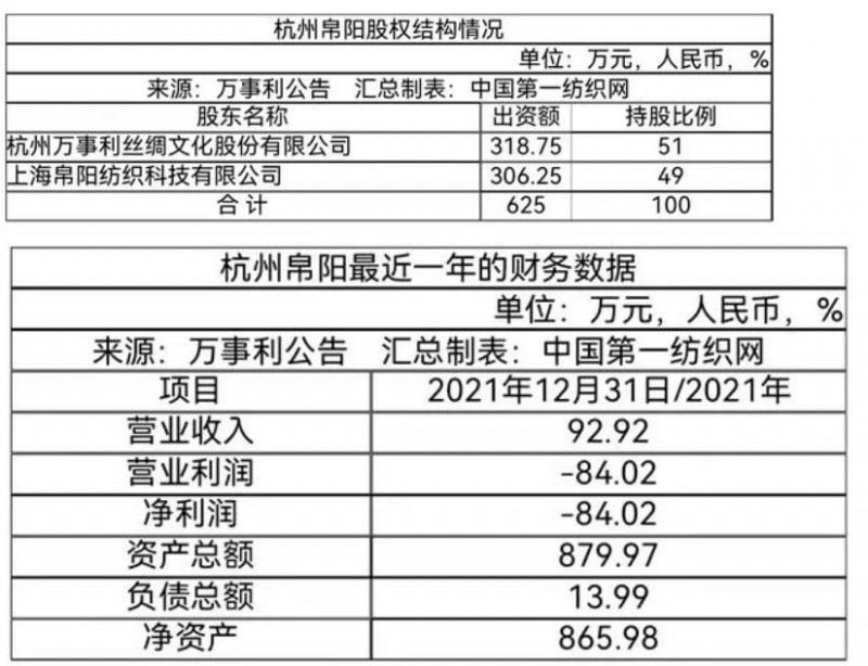 2022年杭州亞運(yùn)會”官方正裝服飾供應(yīng)商、線下零售企業(yè)、絲綢類產(chǎn)品特許生產(chǎn)商——杭州萬事利絲綢文化股份有限公司(以下簡稱“萬事利”)2月24日披露,公司此前以1650萬元收購上海帛陽紡織科技有限公司持有的杭州帛陽新材料科技有限公司(以下簡稱“杭州帛陽”)31%股權(quán)的收購于近日完成了工商變更登記手續(xù),取得了由杭州市錢塘區(qū)市場監(jiān)督管理局換發(fā)的《營業(yè)執(zhí)照》。