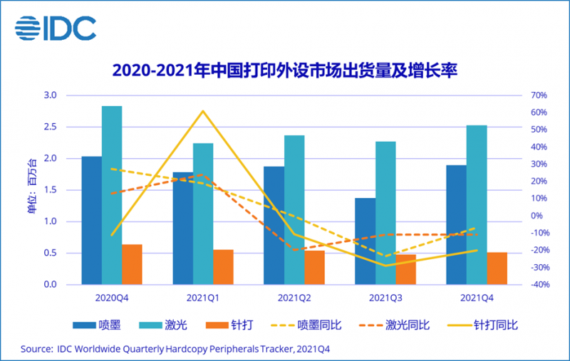 IDC 最新發(fā)布的《中國打印外設(shè)市場季度跟蹤報(bào)告(2021 年第四季度)》顯示,2021 年第四季度,中國打印外設(shè)市場出貨量為 494.2 萬臺,同比下降 10.3%。其中噴墨打印機(jī)出貨量 189.8 萬臺,同比下降 6.7%;激光打印機(jī)出貨量 253.2 萬臺,同比下降 10.7%;針式打印機(jī)出貨量 51.3 萬臺,同比下降 20.0%。