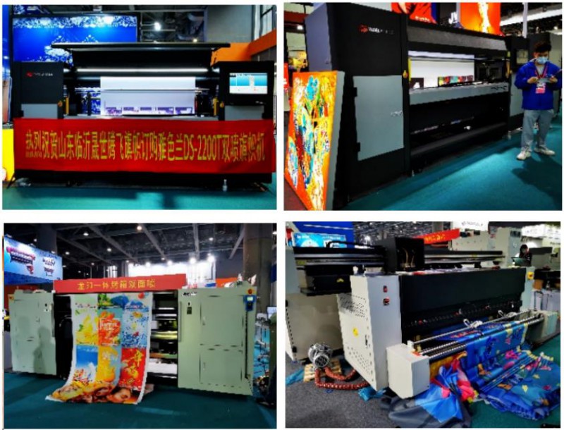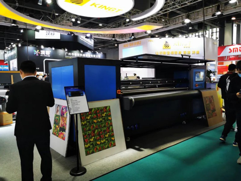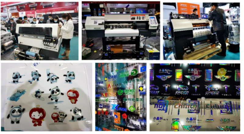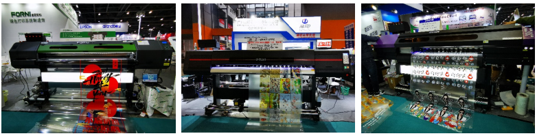 通過走訪小編發(fā)現(xiàn),今年的方案呈現(xiàn)一應(yīng)俱全,有近兩年來熱度不減的彩白彩工藝、不同幅寬的抖粉燙畫打印方案;有工藝技術(shù)日趨成熟,可部分取代絲印等傳統(tǒng)印刷工藝的水晶標(biāo)打印轉(zhuǎn)移方案;有旗幟布、貢緞等雙噴布類直噴方案;有針對(duì)PU等皮革的水性、UV打印方案;有針對(duì)瓦楞包裝領(lǐng)域的掃描式印刷方案;有針對(duì)工業(yè)領(lǐng)域小微物品視覺定位的打印方案;有圓柱體椎體360度無拼接打印的方案;有針對(duì)異形和高落差的微高噴打印的方案;也有針對(duì)水晶標(biāo)的燙金燙銀新方案以及卷材、板材上的UV光油燙金方案等等。各大品牌各有所長。