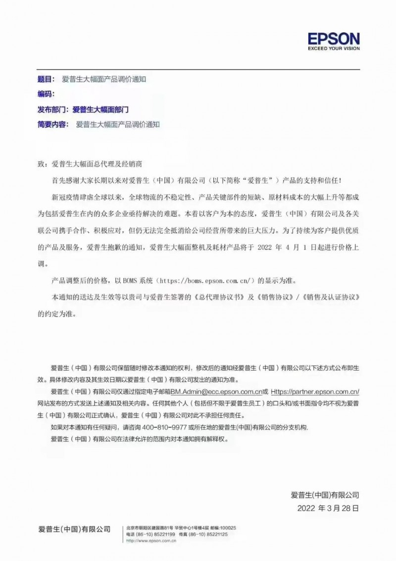 產(chǎn)品調(diào)整后的價格,以BOMS系統(tǒng)(https://boms.epson.com.cn/)的顯示為準(zhǔn)。