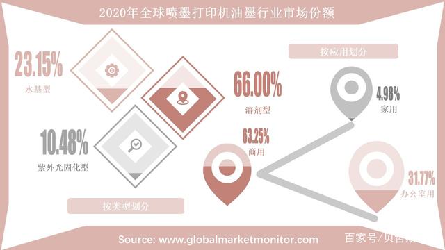 目前,溶劑型油墨在三種類型產(chǎn)品中的應(yīng)用最為廣泛、在市場的比重最大。數(shù)據(jù)顯示,2020年,溶劑型油墨市場占比達66.00%,其次是水基型,占比23.15%,紫外光固化型普及性相對較低,2020年所占市場份額為10.48%。從不同應(yīng)用領(lǐng)域來看,商用噴墨打印油墨市場占比最高,為63.25%;其次是用于辦公室,市場比重31.77%;而僅4.89%作為家用。