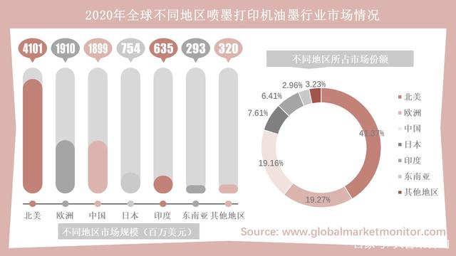 從地區(qū)來看,北美是全球噴墨打印機油墨行業(yè)最大的營收市場,2020年該地區(qū)市場規(guī)模為41.01億美元,占據(jù)全球41.37%的市場份額;其次,歐洲以19.10億美元的市場規(guī)模及19.27%的市場份額位居第二;中國是第三大營收市場,2020年市場規(guī)模達18.99億美元,在全球市場占比為19.16%,與作為第二大市場的歐洲僅相差0.09%。