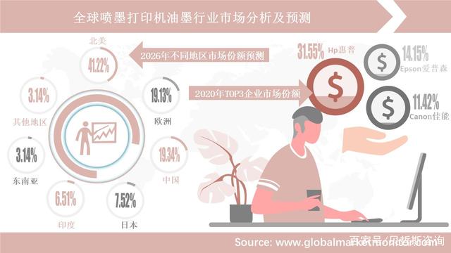 全球噴墨打印機油墨行業(yè)2020年總市場規(guī)模為99.12億美元,在此基礎(chǔ)上,我們進行了系列函數(shù)運算,并以科學(xué)模型推導(dǎo)了未來6年的數(shù)據(jù),最后可預(yù)測,到2026年該行業(yè)全球總市場規(guī)模將達144.39億美元。2020-2026年復(fù)合年增長率為6.47%。此外,預(yù)計各個地區(qū)市場份額也將有所變化。北美、歐洲地區(qū)2026年市場份額分別預(yù)計為41.22%、19.31%,都將有所下降;而中國市場份額預(yù)計增至19.34%,將取代歐洲成為全球第二大市場,中國噴墨打印機油墨市場前景可觀。由于制造成本和勞動力成本較低,亞太地區(qū)為行業(yè)發(fā)展提供了許多機會,該地區(qū)或?qū)⒊蔀楦髌髽I(yè)建立大規(guī)模生產(chǎn)工廠的理想地點,故整個亞太市場的前景也值得期待。