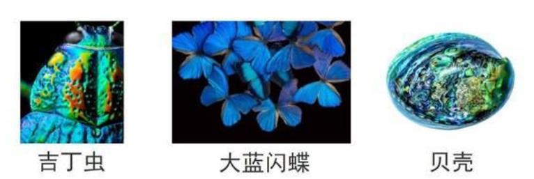 結構色是表面微細結構與不同波長的光相互作用引起的顯色現(xiàn)象。即使物質(zhì)本身不含色素,其微細結構使反射光產(chǎn)生衍射或干涉,看上去就會顯出顏色。如同自然界中的大藍閃蝶、吉丁蟲、貝殼等,這些結構色的特點是色彩極其鮮艷亮麗。