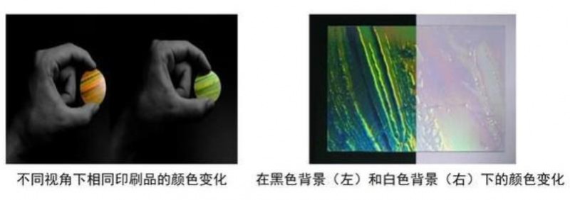用結構色噴墨技術打印出的同一件印刷品,根據(jù)視角不同顏色也會變化。同時,色調(diào)還會根據(jù)背景顏色而變化。當在黑色背景上裝飾結構色時,透射光被吸收,結構色的反射色可見,而在白色背景上,透射光不被吸收,其互補色可見。