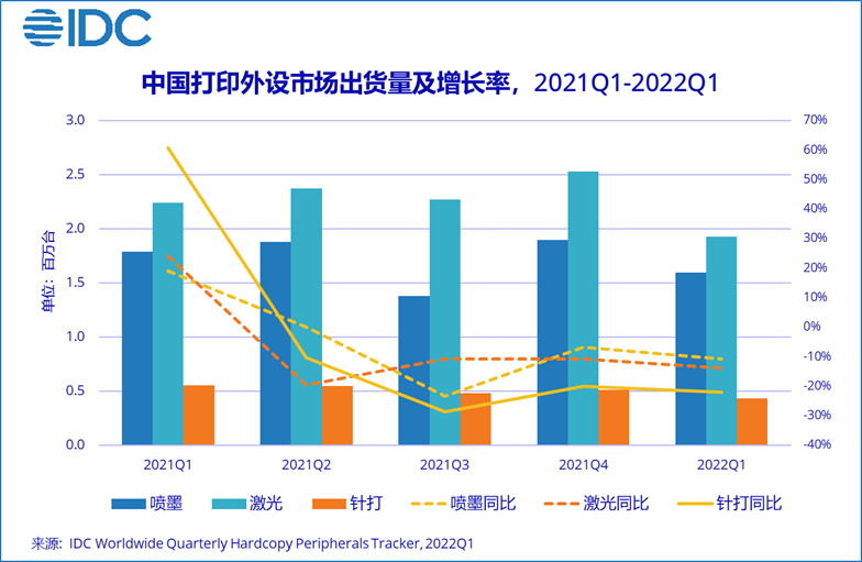 IDC最新發(fā)布的《中國(guó)打印外設(shè)市場(chǎng)季度跟蹤報(bào)告(2022年第一季度)》顯示,2022年第一季度,中國(guó)打印外設(shè)市場(chǎng)出貨量為395.9萬臺(tái),同比下降13.7%。其中噴墨打印機(jī)出貨量159.6萬臺(tái),同比下降10.8%;激光打印機(jī)出貨量193.0萬臺(tái),同比下降14.0%;針式打印機(jī)出貨量43.3萬臺(tái),同比下降22.0%。