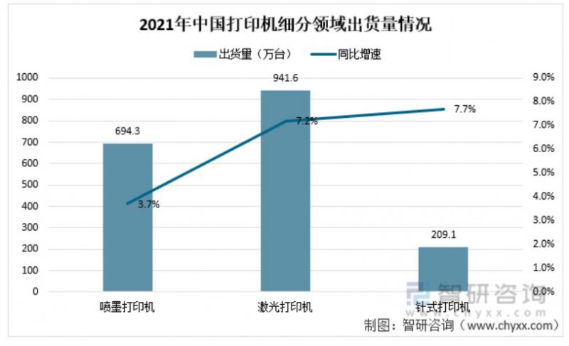 從打印機(jī)細(xì)分領(lǐng)域出貨量情況看,2021年噴墨打印機(jī)出貨量694.3萬(wàn)臺(tái),同比下降3.7%;激光打印機(jī)出貨量941.6萬(wàn)臺(tái),同比下降7.2%;針式打印機(jī)出貨量209.1萬(wàn)臺(tái),同比下降7.7%。