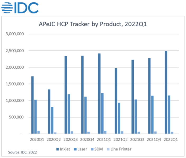 根據(jù)IDC數(shù)據(jù),2022年第一季度,亞太區(qū)打印機(jī)市場(chǎng)(不含日本和中國(guó))出貨量為371萬(wàn)臺(tái),比一年前的372萬(wàn)臺(tái)下降了0.4%。這意味著著該地區(qū)自2021年第三季度以來(lái),已連續(xù)三個(gè)季度出現(xiàn)了同比下降。但根據(jù)追蹤數(shù)字,各個(gè)季度之間的出貨量在不斷改善。
