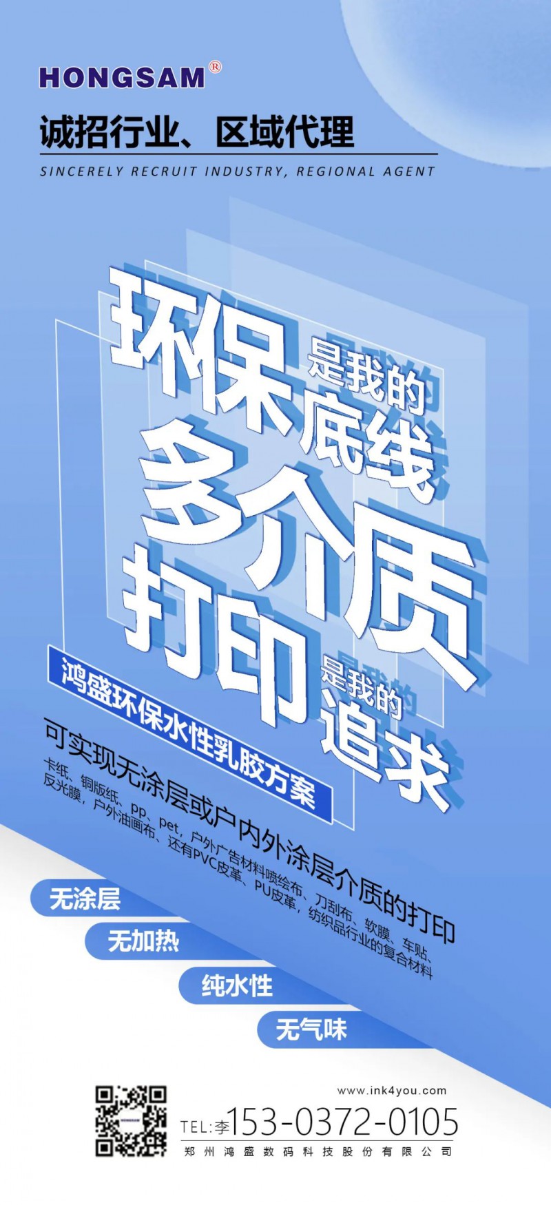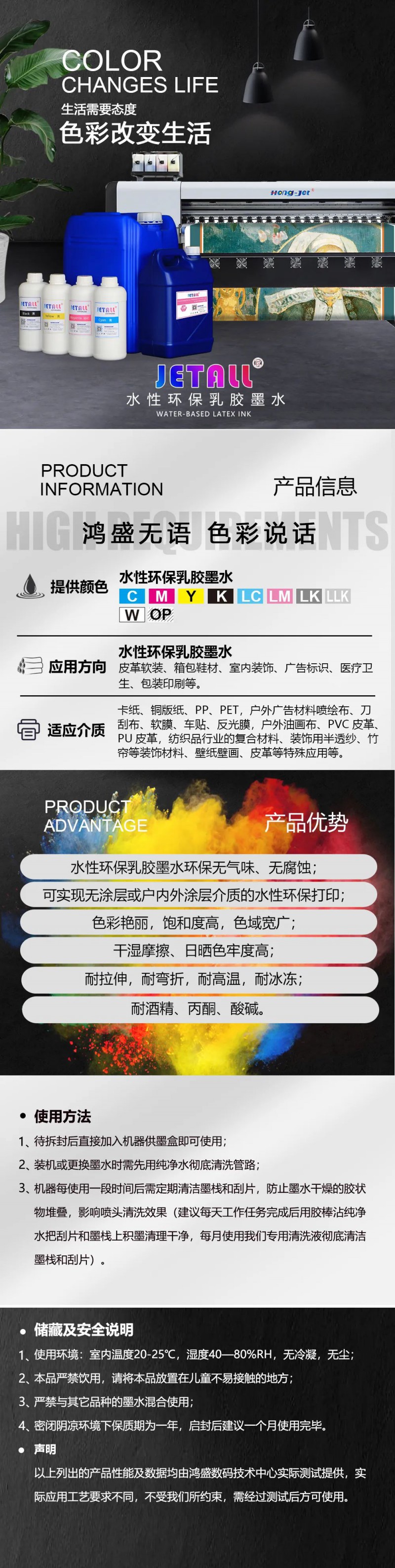 水性環(huán)保乳膠墨水,解決了水性墨水在非吸收材料的成像及牢度問題,同時具有高日曬牢度,加上其自帶的環(huán)保特性,乳膠墨水給噴墨行業(yè)帶來了很多驚喜,每一次墨水功能性的驗證、每一次應用領域的拓展,都在宣告著噴墨打印行業(yè)屬于水性乳膠墨水的時代已經開啟,正在助力傳統(tǒng)行業(yè)的數碼化進程!