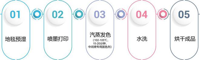 第一種由于面料決定不能使用,第二種由于國內(nèi)地毯機是一整條生產(chǎn)線,不可能密封下罐蒸,只能連續(xù)性汽蒸發(fā)色,連續(xù)汽蒸發(fā)色的溫度只能在102℃左右。這樣同樣的也會出現(xiàn)發(fā)色不充分,有浮色,必須經(jīng)過水洗才能提升牢度。改性滌綸如果低溫發(fā)色就只能選擇低溫分散去做,這樣在存放和背膠復(fù)合時容易產(chǎn)生色遷移到復(fù)合背膠里面,造成背部有顏色而產(chǎn)生次品。然而陽離子染料墨水可以在102℃汽蒸充分發(fā)色而不會有浮色產(chǎn)生,因此可以不用水洗,并且復(fù)合背膠和存放時也不會產(chǎn)生色遷移現(xiàn)象。因為陽離子染料相對于分散染料來說更耐日曬,所以我們針對改滌,腈綸面料專門研制出陽離子染料墨水。