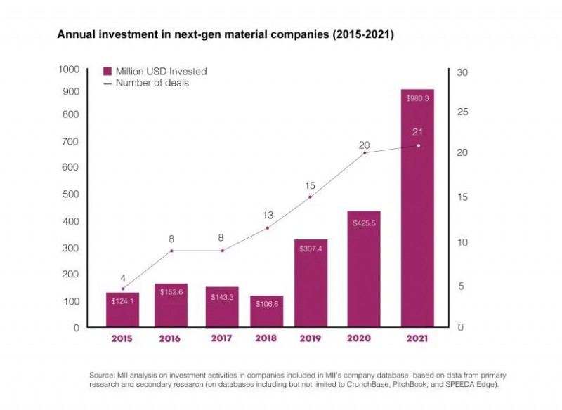 自2015年以來,新材料行業(yè)投資總額達(dá)到23億美元,2021年的投資額比2020年增加了一倍以上。即使在新冠疫情的影響下,僅2021年一年的投資額就幾乎相當(dāng)于此前4年的總和。