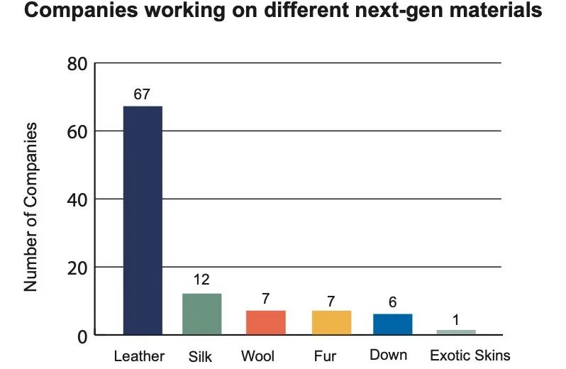 MII表示,在過去的八年中新材料公司數(shù)量正在大幅增加,且該市場仍處于萌芽狀態(tài)。截至2021年底,共計(jì)95家新材料公司,大多數(shù)公司都是在2014年之后成立的(55家),有10家公司是在疫情后成立的,其中,67家專注于動(dòng)物皮革的仿生研究,12家專注于絲綢,7家專注于羊毛,7家專注于毛皮,6家專注于羽絨,1家專注于稀有皮革。