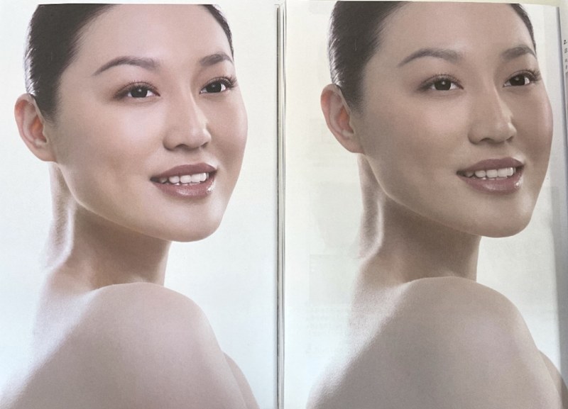 由于噴墨輪轉(zhuǎn)印刷網(wǎng)點(diǎn)擴(kuò)大很小,在膠版紙張上也實(shí)現(xiàn)了傳統(tǒng)膠印所不易實(shí)現(xiàn)的調(diào)頻網(wǎng)印刷。從理論上講,網(wǎng)點(diǎn)越小,圖像分辨率越高。1200dpi噴頭打印出1.5pl大小墨滴形成的網(wǎng)點(diǎn)直徑大概在21-30μm,其網(wǎng)點(diǎn)要小于300線傳統(tǒng)印刷的50%的網(wǎng)點(diǎn)(約85μm)。因此1200dpi的噴墨印刷,實(shí)際分辨率已經(jīng)超越了傳統(tǒng)300線的印刷品質(zhì)。如下圖所示,同一圖像使用1200dpi噴墨印刷和175線傳統(tǒng)膠印印刷的圖像在100倍的放大鏡下的效果對(duì)比。很明顯,采用1200dpi的噴墨輪轉(zhuǎn)印刷的網(wǎng)點(diǎn)明顯比175線傳統(tǒng)印刷的網(wǎng)點(diǎn)細(xì)膩很多。相對(duì)于膠版紙印刷175線的調(diào)幅網(wǎng)點(diǎn)構(gòu)成的圖像,1200dpi細(xì)膩的調(diào)頻網(wǎng)點(diǎn)猶如在膠版紙上實(shí)現(xiàn)照片質(zhì)量,圖像更加細(xì)膩。沒有了傳統(tǒng)膠印的油墨加水以后的油墨乳化造成的飽和度降低,調(diào)頻網(wǎng)印刷的人物圖像色彩更加飽和,圖像層次更加細(xì)膩和清晰。