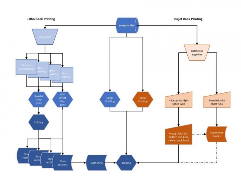 噴墨書籍印刷一直處于領(lǐng)先地位。許多高速噴墨卷筒印刷機(jī)與包括 Hunkeler、Tecnau、Müller Martini 或 Magnum 在內(nèi)的公司的整理線相結(jié)合,所有這些都可以提供準(zhǔn)備裝訂的成品書芯。有些生產(chǎn)線提供用于縫紉和縫合的部分,或粘在堆棧中的頁面。即時調(diào)整分頁和格式更改。緩沖站確保噴墨印刷機(jī)始終以全額定速度打印,除非需要更換紙張。與平版紙相比,浪費(fèi)較低。一名操作員可以在一個班次中運(yùn)行整條印刷數(shù)千本書的生產(chǎn)線。噴墨消除了制版、印刷準(zhǔn)備、印刷、(存儲)、折疊、(存儲)、整理、收集和裝訂。所有部分的數(shù)量差異會導(dǎo)致浪費(fèi),而在所有部分都打印完之前無法開始裝訂。 集成噴墨系統(tǒng)允許圖書印刷商向客戶提供新的模式,按需印刷從一份到數(shù)千份,從而使出版商能夠減少庫存,降低出版風(fēng)險。