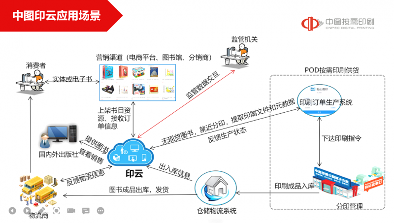中圖按需印刷正在建設(shè)“中圖印云”服務(wù)平臺,并希望與引入像方正電子這樣的企業(yè)進(jìn)行深度技術(shù)合作。該系統(tǒng)由兩條業(yè)務(wù)主線構(gòu)成。在銷售端,充分發(fā)揮中圖原版圖書資源優(yōu)勢,對接云書房、京東、天貓、當(dāng)當(dāng)?shù)茸杂泻偷谌戒N售平臺,開拓C端市場。積極開展與國內(nèi)出版社的資源合作,實現(xiàn)斷版書、短版書、長尾圖書等中文圖書的POD銷售。建設(shè)海外原版圖書和中文圖書在網(wǎng)絡(luò)平臺、實體書店等渠道的按需銷售解決方案。在供應(yīng)鏈端,為印刷委托方提供一站式生產(chǎn)解決方案,提供數(shù)字化服務(wù),助力數(shù)字化轉(zhuǎn)型,重塑圖書發(fā)行業(yè)供應(yīng)鏈。提供文件規(guī)范化、云存儲、數(shù)據(jù)加密、版權(quán)管理等數(shù)字資產(chǎn)管理服務(wù);解決國內(nèi)圖書按需生產(chǎn)、異地分印、就近配送及中文圖書海外快速供應(yīng);解決斷版圖書的及時生產(chǎn)和供應(yīng)等問題。