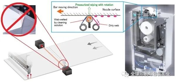 同樣重要的是能夠從不太嚴(yán)重的印刷質(zhì)量問題原因中恢復(fù)。盡管優(yōu)化了噴嘴潤濕涂層以減少墨霧累積的影響,但在某些時候,噴嘴方向和噴射可能會在長時間印刷后惡化。然后,自動清潔系統(tǒng)成為減少對生產(chǎn)力的連鎖反應(yīng)的有效方法。