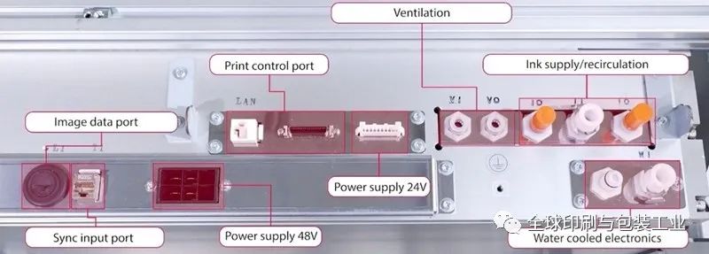 Fujifilm Samba JPC Printbar在其一體化設(shè)計(jì)中包含所需的電子設(shè)備,并在一個面板中提供用于電源、數(shù)據(jù)和油墨的連接。