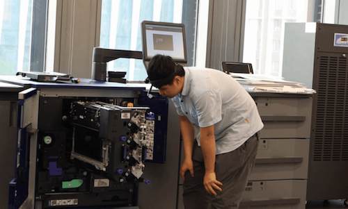 如遇到較難解決的問題,部分經(jīng)銷商或柯尼卡美能達CX統(tǒng)括部客戶服務(wù)部員工可使用AR智能眼鏡來進行輔助,為非現(xiàn)場工程師展示“第一視角”?,F(xiàn)場作業(yè)人員可通過線上專家的AR標注、虛擬白板等操作指示進行修復(fù)及調(diào)試,在“有效4小時”承諾內(nèi)大幅縮短排查時間,高效解決用戶設(shè)備故障問題。