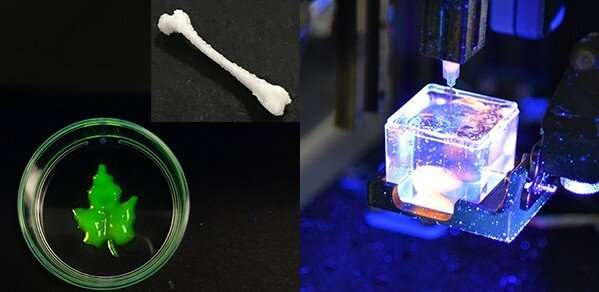 使用“Printer.HM”可實現(xiàn)復(fù)雜的設(shè)計。從左至右,帶有纖維素基水凝膠的一個葉形支架;用生物陶瓷水凝膠打印的股骨模型;在支撐槽中嵌入打印。