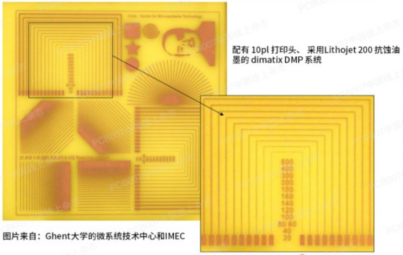 為了提高速度和密度,噴墨技術借鑒了DMD微鏡曝光技術,現(xiàn)在使用多個噴墨打印頭來實現(xiàn)這一性能。圖4顯示了Ghent大學微系統(tǒng)技術中心(Center for Microsystems Technology,簡稱CMST)和IMEC的測試載體,其蝕刻走線可達40μm。