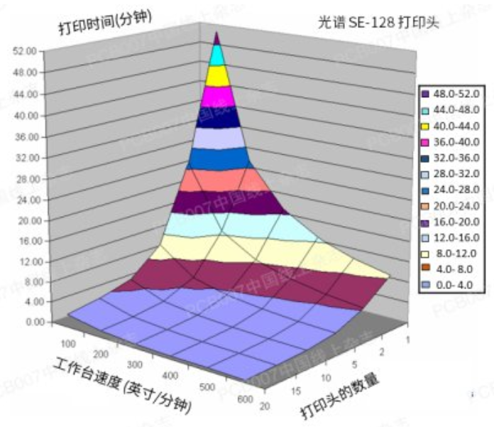 圖6:不同的打印時間與工作臺速度和打印頭數(shù)量的關系