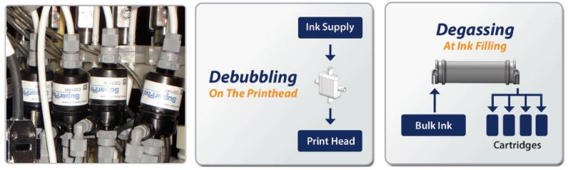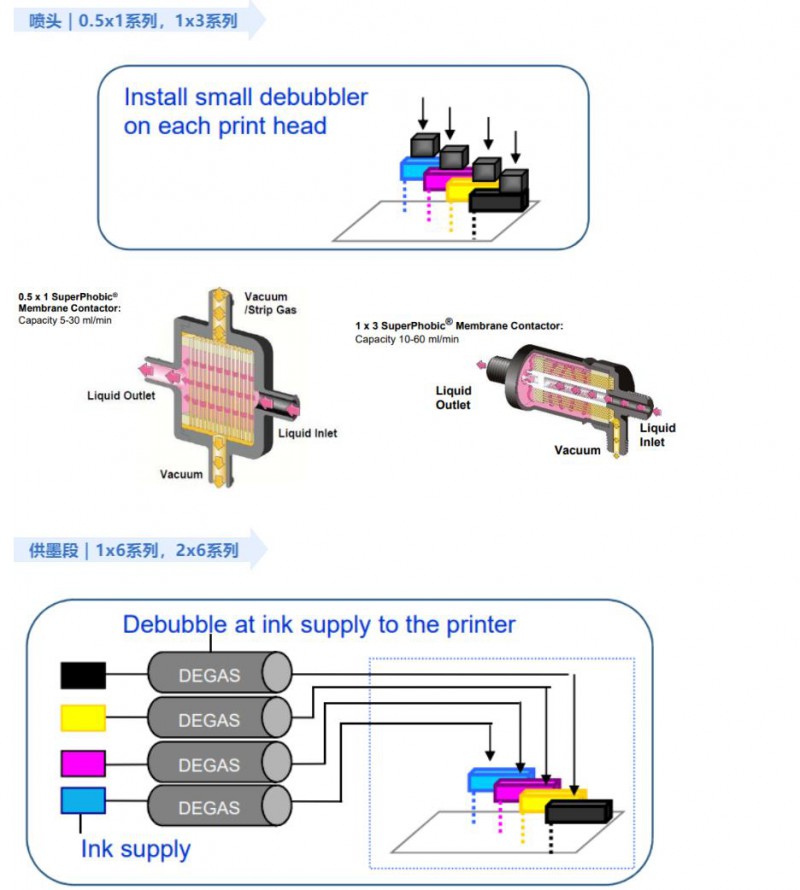 而噴墨中的溶解氣體會導(dǎo)致噴頭的斷墨,造成打印斷線、誤噴、滴墨等缺陷,進(jìn)而產(chǎn)生停機(jī),影響生產(chǎn)效率。而墨盒生產(chǎn)罐裝過程中的氣泡也會導(dǎo)致發(fā)泡現(xiàn)象,影響產(chǎn)量。因此,解決噴墨打印生產(chǎn)工藝中的氣泡問題,成為了能夠確保高速打印機(jī)流暢運行的重要技術(shù)。