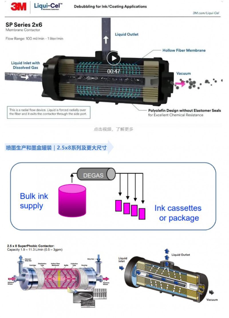 3M™ Liqui-Cel™ SP系列膜接觸器 (脫氣膜) 適用于低表面張力流體的脫氣工藝,采用優(yōu)異的膜絲和膜組件設(shè)計,可以在線快速脫除噴墨中的溶解氣體,滿足對于打印速度和質(zhì)量的各種要求。