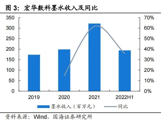 從收入體量角度來看,2021年藍(lán)宇股份收入2.72億元,同比增長73%,2019-2021年CAGR為45.8%,近兩年持續(xù)快速增長(由于主營收入多數(shù)為墨水業(yè)務(wù)收入,未進(jìn)一步拆分)。2021年宏華數(shù)科收入9.43億元,同比增長31.7%,2019-2021年CAGR為26.3%;2021年墨水業(yè)務(wù)收入3.22億元,同比增長61.7%,2019-2021年CAGR為36.2%。對比而言,兩家公司墨水收入體量較為接近,且近兩年均保持較快增速。