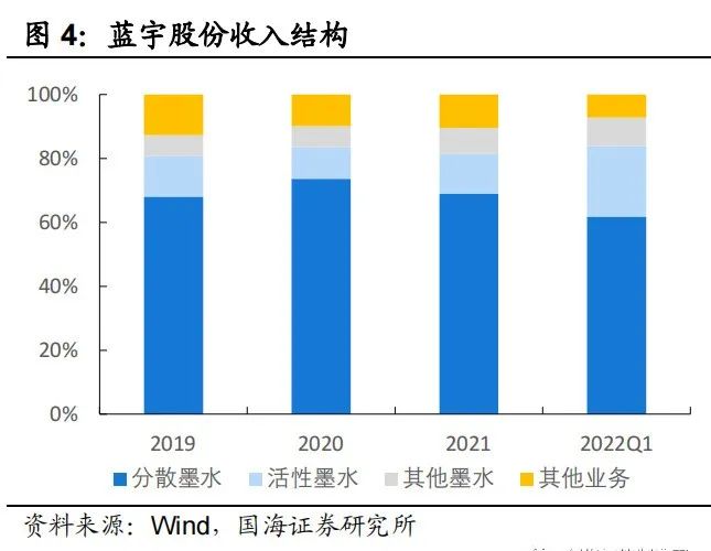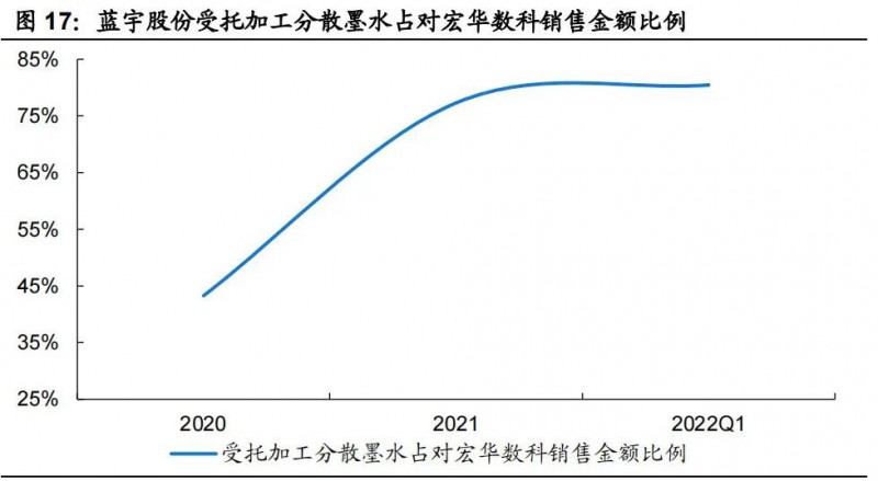 根據(jù)藍(lán)宇股份招股書,藍(lán)宇股份分散墨水受托加工模式僅針對宏華數(shù)科,且宏華數(shù)科于2019-2022Q1期間為藍(lán)宇股份第一大客戶,占銷售金額的13%以上;同時(shí),藍(lán)宇股份受托加工分散墨水占對宏華數(shù)科銷售金額的比例從2020年的43.3%提升至2022Q1的80.5%,為宏華數(shù)科自藍(lán)宇股份采購的主要產(chǎn)品。