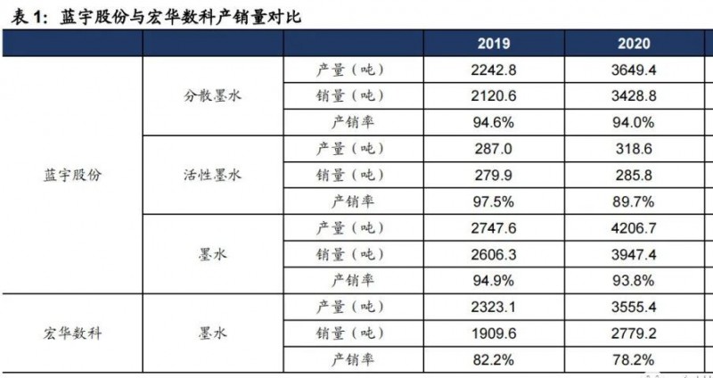 綜合工藝和供應(yīng)來看,1)活性墨水方面,宏華數(shù)科收購天津晶麗后開始覆蓋合成、提純環(huán)節(jié),藍(lán)宇股份在優(yōu)化工藝、新建車間后減少對晶麗色漿采購的依賴,兩家公司已具備較強(qiáng)的活性墨水多流程自制能力;2)分散墨水方面,宏華數(shù)科仍有較多分散墨水來源于藍(lán)宇股份的受托加工。