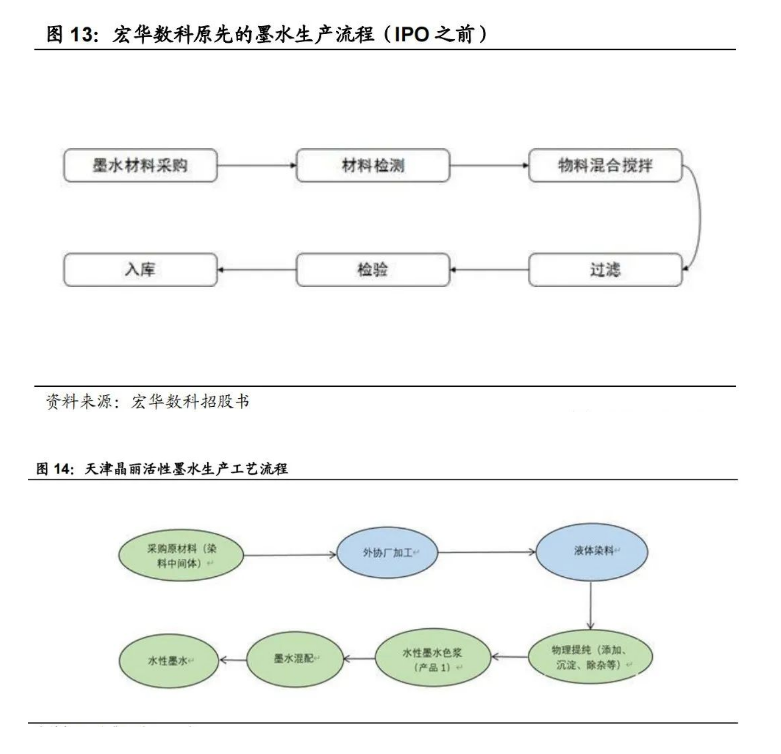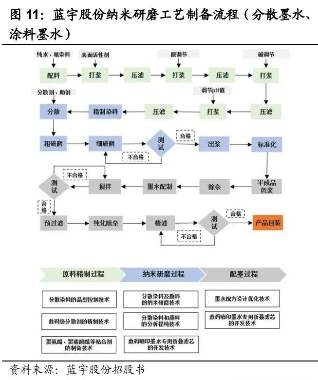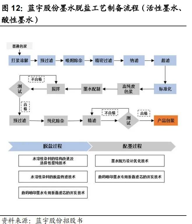 從工藝和供應(yīng)鏈位置來看,藍(lán)宇股份主要為納米研磨工藝(針對分散墨水、涂料墨水)和脫鹽工藝制備流程(針對活性墨水、酸性墨水),納米研磨工藝為將非水溶性的染料研磨為納米級顆粒,利用分散劑分散入水;而脫鹽工藝為將易溶于水的染料通過活性炭吸附除雜、膜處理等工藝脫鹽生產(chǎn)墨水。宏華數(shù)科于IPO及之前的墨水工藝主要為不涉及合成、提純的墨水混配,于今年收購天津晶麗后將流程覆蓋至活性墨水的合成、提純環(huán)節(jié),已具備活性墨水多數(shù)環(huán)節(jié)自制的能力。