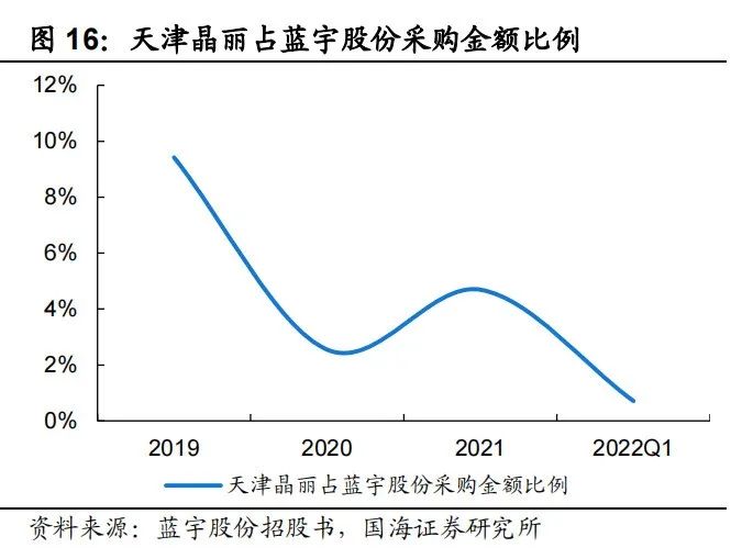 另一方面,天津晶麗(2022年4月以后成為宏華數(shù)科控股子公司)在2019、2021年為藍(lán)宇股份的第三大供應(yīng)商,采購金額占比分別為9.4%、4.7%;其后,隨著藍(lán)宇股份脫鹽納濾工藝大幅改進(jìn),2021年開始新建脫鹽納濾車間并于當(dāng)年9月正式使用,2022Q1采購金額占比下降至0.7%。