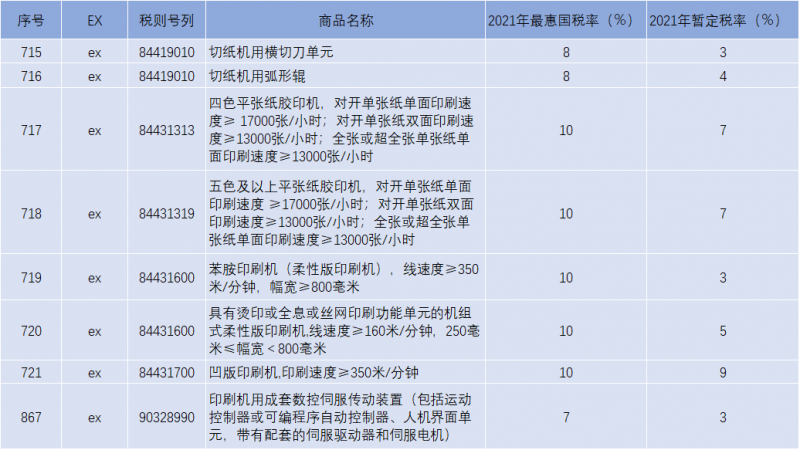 4、對于傳統(tǒng)印刷設(shè)備類產(chǎn)品,如部分平張紙膠印機、柔性版印刷機、凹版印刷機等依然實施暫定稅率,最惠國稅率幾乎沒有變化,且暫定稅率無變化。