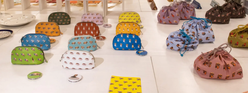 該系列包括皮革制品和服裝制品(圖中是兩款最受歡迎的帶有寵物圓點(diǎn)設(shè)計(jì)元素的化妝包和家居褲)