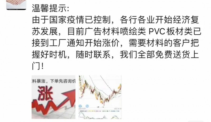 緊接著耗材經(jīng)銷商的也開(kāi)始曬出漲價(jià)通知,并爆料:目前廣告材料噴繪類、pvc板材類已經(jīng)接到工廠通知開(kāi)始漲價(jià),需要材料的客戶,一定要把握時(shí)機(jī)!。