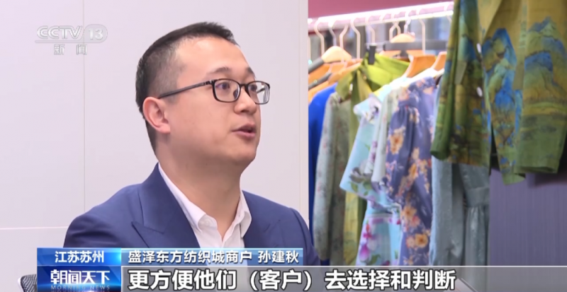 盛澤東方紡織城商戶 孫建秋:可以更直觀地看出它的垂感,通過旋轉(zhuǎn)的方式,在每個角度都可以看到面料的一個情況和一個成衣的情況,更方便他們(客戶)去選擇和判斷。
